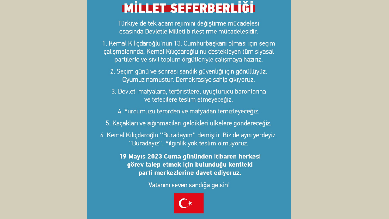 مواطنون ، بعد الانتخابات الرئاسية التي أجريت في 14 مايو إلى الجولة الثانية ، على مواقع التواصل الاجتماعي ، “نداء لتعبئة الوطن!” أطلق الحملة. تم تضمين البيانات التالية في الدعوة إلى الحملة ، والتي أيدها أيضًا الباحث السياسي أوزغون إمري كوتش.
