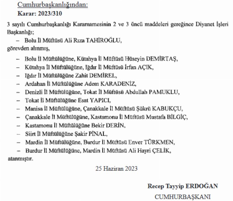 Polo’ya atandı Kütahya Iğdır İğdır İrfan Açık müftülüğe atandı. Iğdır Zahit Demirel Müftü. Ardahan Adem Karadeniz Müftülük makamına, Denizli Tokat Müftüsü Abdullah Pamuklu’dan Müftülüğe. tokat Yapıcı’yı müftülük makamına isat, Manisa Çanakkale Müftüsü Şükrü Kabukçu, Müftülüğe, Çanakkale Mustafa Bilgeş Kastamonu Müftüsü Müftülüğüne, Kastamonu Müftü adına Bekir Derin, sertifika Şakir Binal, Müftülüğe, Mardin Burdur Müftüsü Enver Türkmen müftü olarak atandı. Burdur Mardin Müftüsü Ali Hayri Çelik müftülüğe atandı.