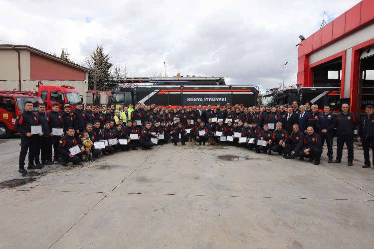 Konya Büyükşehir Belediye Başkanı Uğur İbrahim Altay, depremin ardından Hatay’da görev yapan ve 168 vatandaşın enkazı temizlemesine yardımcı olan Konya İtfaiyesi personeline teşekkür belgeleri takdim etti.Konya (İGFA) – Konya Büyükşehir Belediye Başkanı Uğur İbrahim Altay, Hatay’da özveriyle çalışan Konya İtfaiyesi personelini ziyaret etti.
