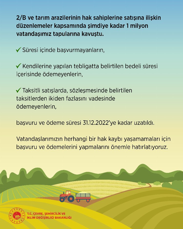Çevre, İnşaat ve İklim Değişikliği Bakanlığı, 2/B ve hazineye ait tarım arazileri için başvuru ve ödeme süresinin 31 Aralık 2022 olduğunu açıkladı.Ankara (IGFA) – Tarım arazilerinin 2/b hak sahiplerine satışına ilişkin düzenleme ve bugüne kadar bir milyon vatandaşın edindiği tarım arazileri hakkında Çevre, Şehircilik ve İklim Değişikliği Bakanlığı’ndan bilgi geldi.