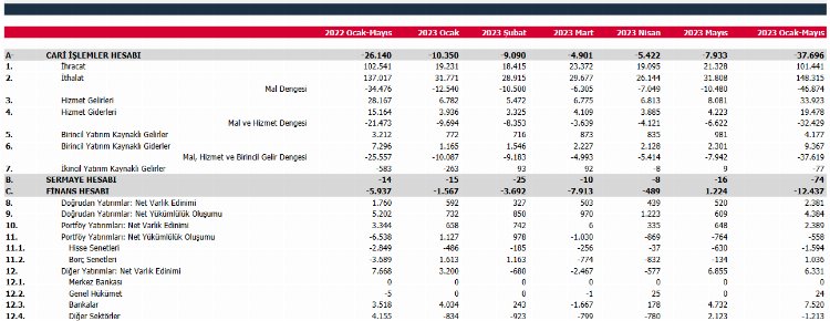 Merkez Bankası Mayıs ayı ödemeler dengesi istatistiklerini paylaştı. Buna göre Mayıs ayında cari açık 7 milyar 993 milyon dolar olarak gerçekleşti.Ankara (IGFA) – Mayıs ayında cari açık 7 milyar 933 milyon dolar olarak gerçekleşti. Böylece yılın ilk beş ayında cari açık 37 milyar 696 milyon dolar olarak gerçekleşti.