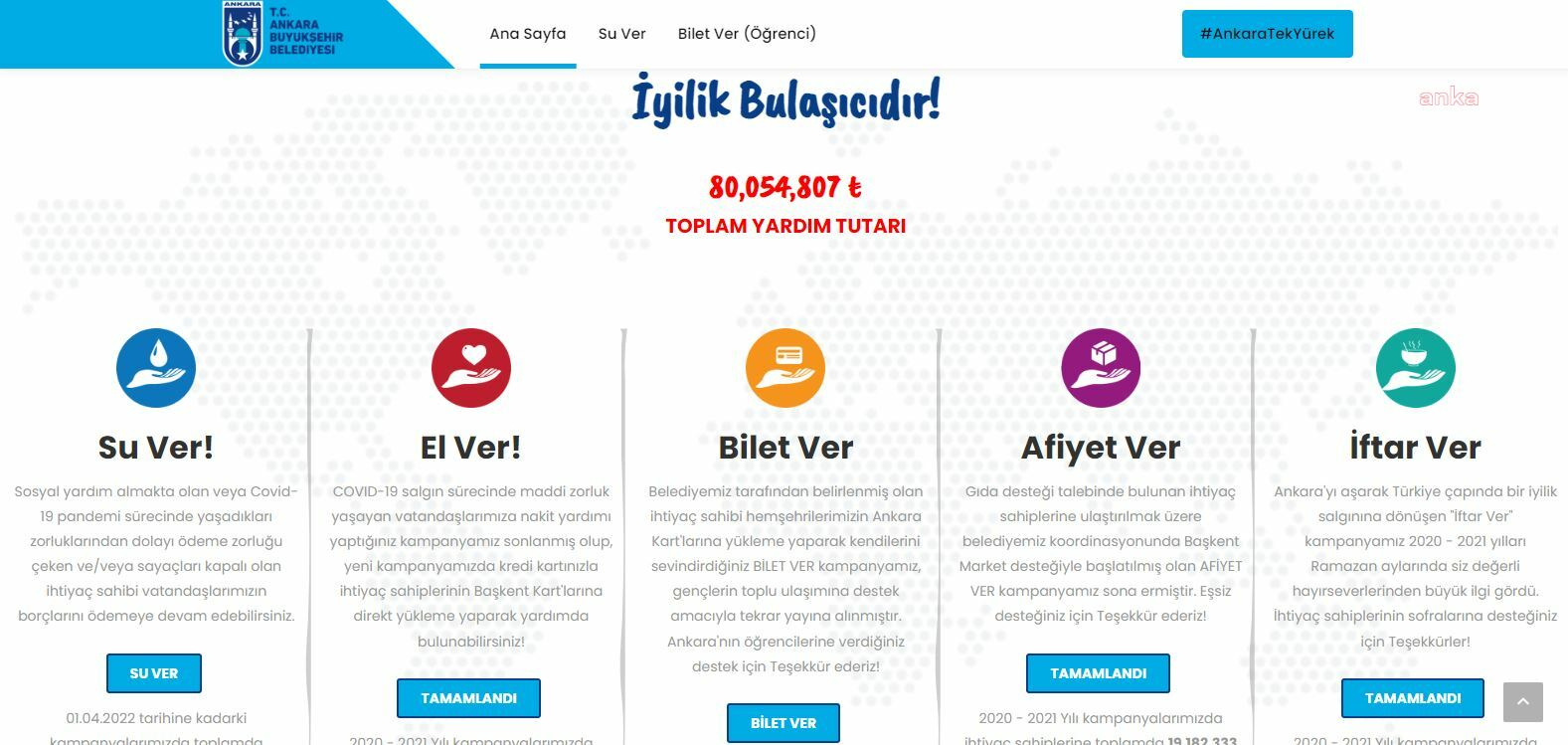 Ankara Büyükşehir Belediyesi’nin (ABB) “6 Milyon Vahidat Gönül” adıyla başlattığı dayanışma kampanyası, yeni yılda da hayırseverlerle ihtiyaç sahiplerini buluşturmaya devam ediyor. “Su Ver” ve “Bilet Ver” kampanyalarına ilgi devam ederken, Dayanışma Hareketi ile 2022 yılında ihtiyaç sahiplerine yaklaşık 12 milyon TL destek verildi.