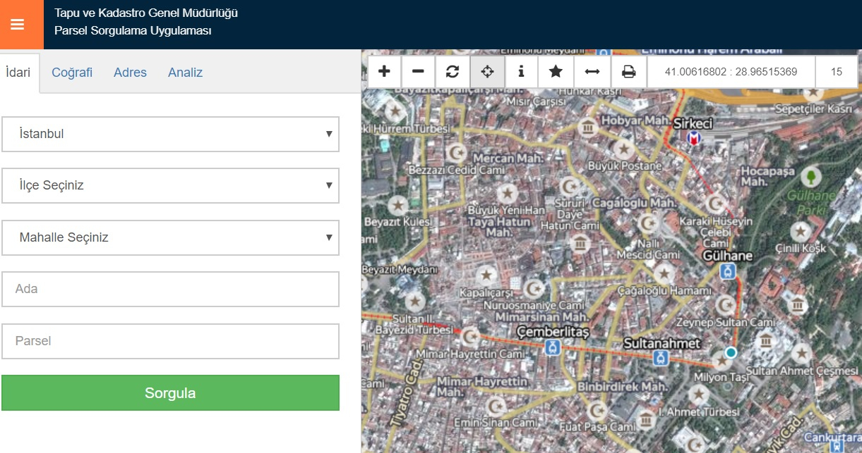 Ayrıca TAKBİS uygulamasına dönüşen iller ve bölgeler için online olarak ada harita planlayıcısından adres bulma işlemi yapılabilmektedir.