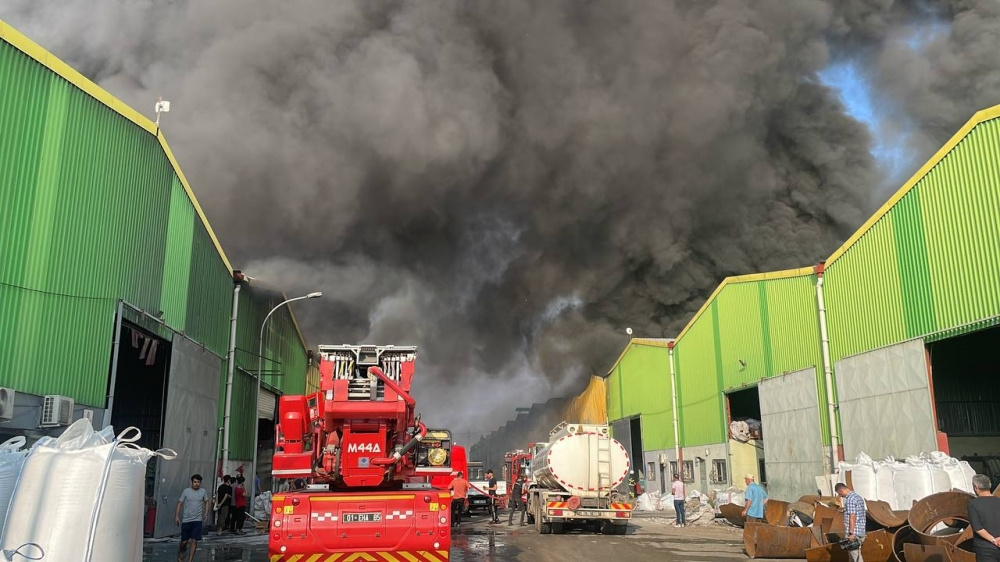 Sarıhamzalı Mahallesi’ndeki geri dönüşüm tesisinde henüz belirlenemeyen nedenle yangın çıktı. Alevler, kısa sürede yandaki kozmetik fabrikasına da yayıldı.