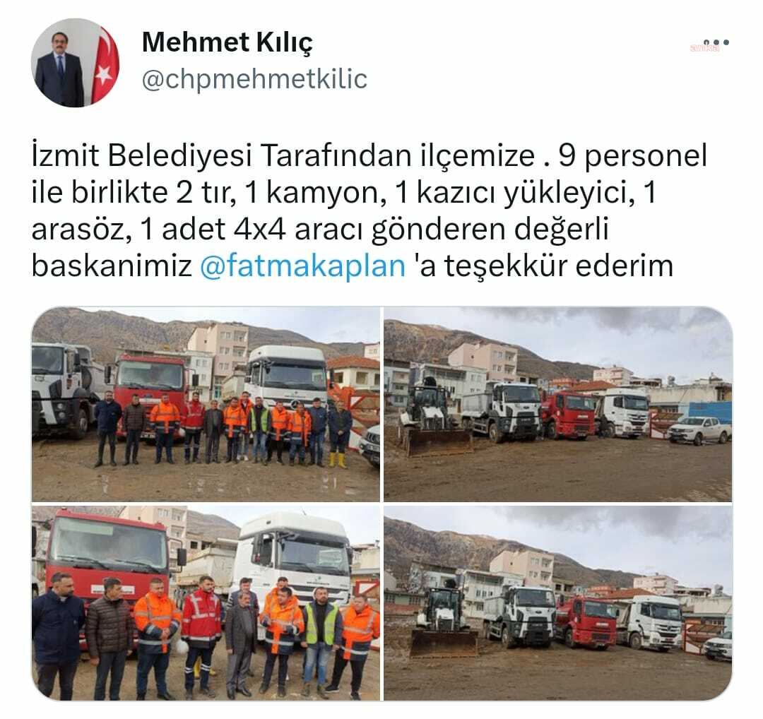 Belediye Başkanı Mehmet Kılıç yaptığı paylaşımda, “9 kişiyle birlikte ilçemize 2 tır, 1 tır, 1 kazıcı, 1 ekskavatör ve 4×4 aracı gönderen Sayın Başkanımız Fatma Kaplan Hürriyet’e teşekkür ediyorum. ”