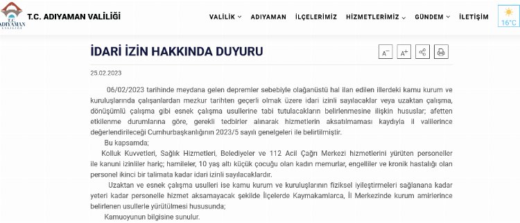 Depremden etkilenen ilçelerden Adıyaman’da Valilik, maddi iyileştirme sağlanana kadar kamu kurum ve kuruluşlarında uzaktan ve esnek çalışma uygulanacağını duyurdu.Adıyaman (İğfa) – İdari izin Adıyaman İl internet sitesinde ilan edildi.