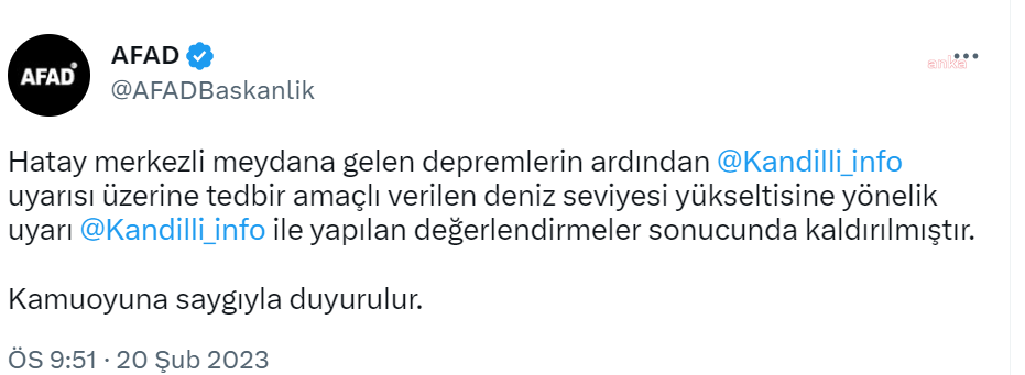 “Hatay’da meydana gelen depremlerin ardından Kandilli Rasathanesi uyarısının ardından tedbir amaçlı yayınlanan deniz seviyesi yükselme uyarısı, Kandilli Rasathanesi ile yapılan değerlendirmeler sonucunda kaldırıldı.”