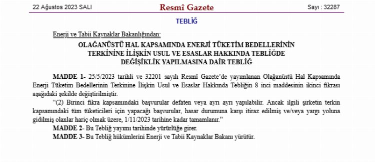 Deprem bölgesinde elektrik ve gaz borçlarının silinmesi için başvuru süresi 1 Kasım’a kadar uzatıldı. Karar bugünkü Resmi Gazete’de yer aldı.