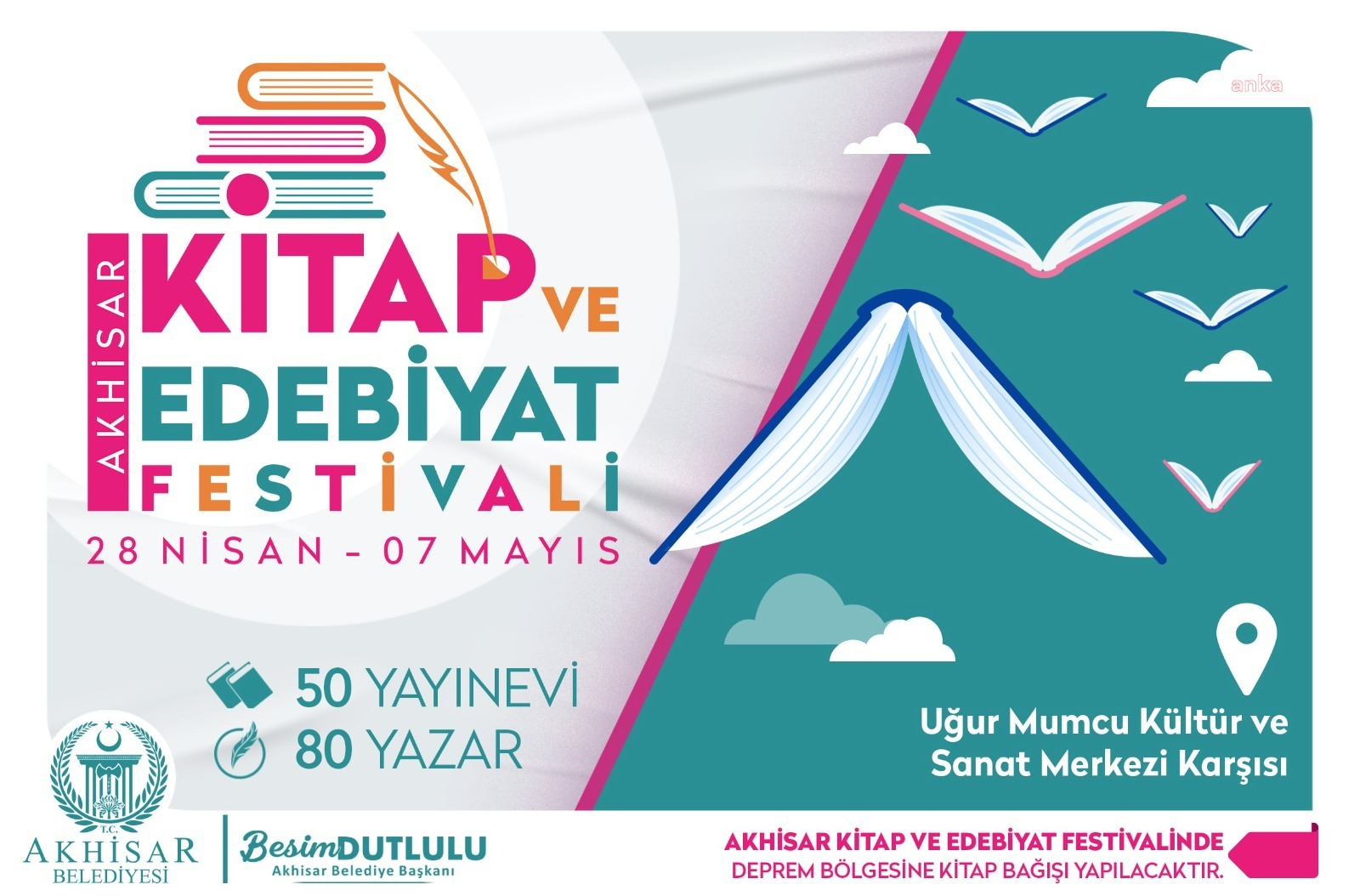 Akhisar Belediyesi’nden yapılan açıklamaya göre, 50 yayınevi ve 80 yazar ile araştırmacı gazeteci ve yazarların katılacağı Akhisar Belediyesi Kitap ve Edebiyat Festivali’ne sanat dünyasının önde gelen isimleri katılacak. Etkinlik, Uğur Mumcu Kültür Sanat Merkezi’nin karşısındaki otoparkta gerçekleştirilecek.