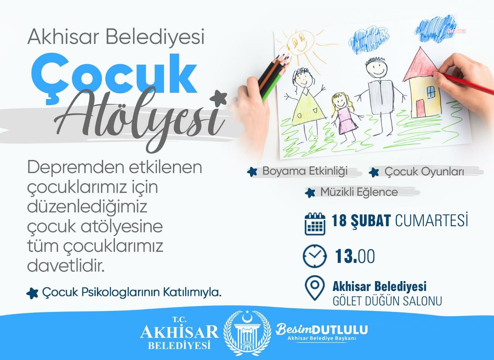 Etkinlik hakkında bilgi veren Akhisar Belediye Başkanı Bissim Dutlulu, “Onların gülüşleri bizim için çok değerli. Deprem felaketinden sonra şehrimize taşınan tüm çocuklarımız için belediyemize bağlı öğretmen ve psikologların katılımıyla çocuk atölyesi düzenliyoruz.” ve deprem haberlerinden etkilendik.Eğleneceğiz,güleceğiz,Sosyal iletişim kuracağız.Özellikle çocuklarımızın buna ihtiyacı olduğuna inanıyoruz.Belediyemizin ve gönüllü psikologların katılımıyla böyle bir etkinlik yapmayı düşündük, sadece afet bölgesinden gelen çocuklarımız için değil, haber kanallarında ya da internette gördüğü talihsiz olaylardan etkilenen çocuklarımız için de geleceğimizi şekillendirecek gençlerimizin ruh sağlığı da çok önemli. Bu bağlamda etkinliğin faydalı olacağına inanıyoruz. Tüm çocukları bu etkinliğe bekliyoruz.