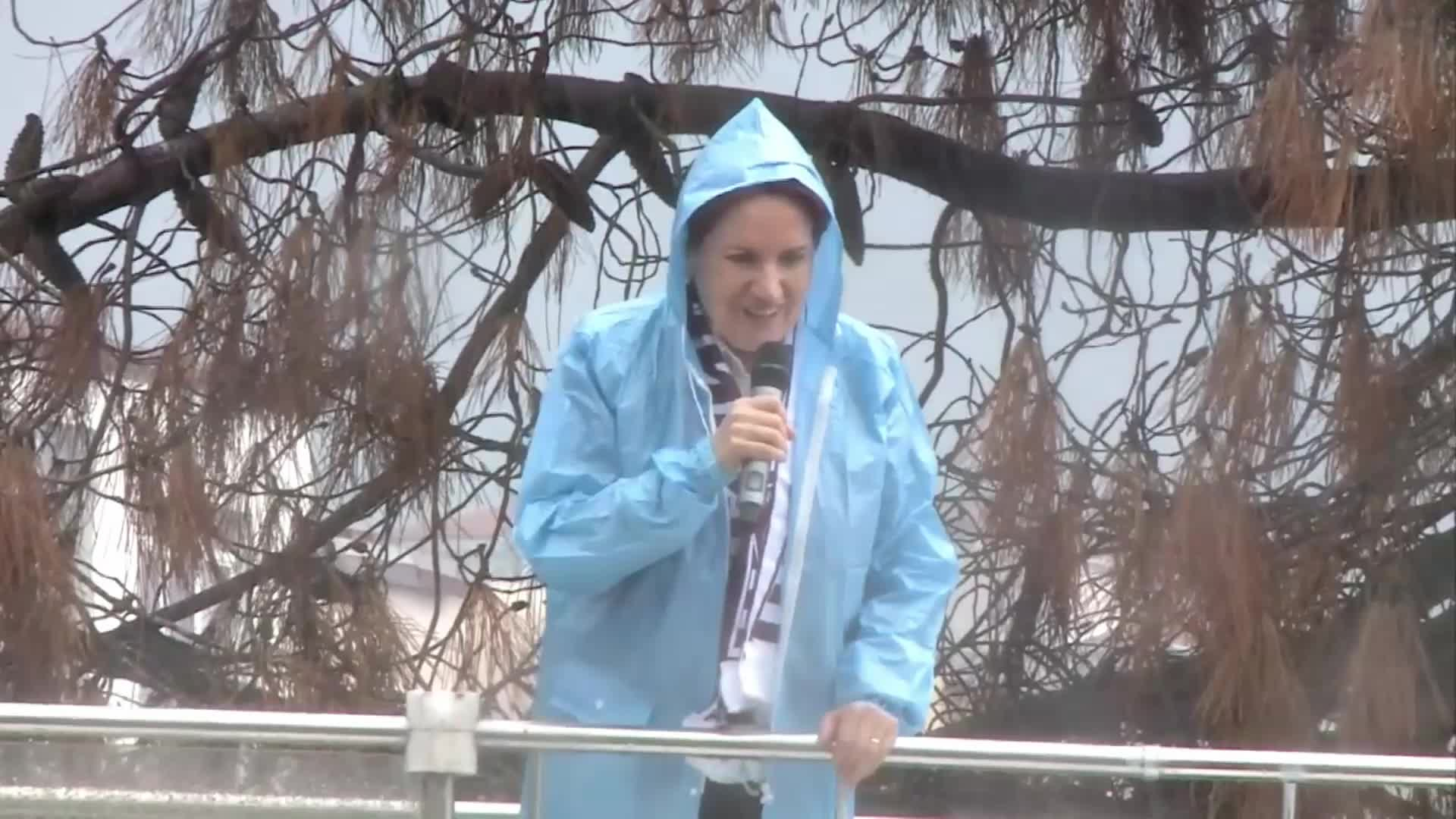 İYİ Parti Genel Başkanı Meral Akşener, Ankara Belediye Başkanı Mansur Yavaş ile birlikte Sinop İskele Meydanı’nda vatandaşlara seslendi. Sağanak yağmur ve doluda yağmurluk giyen Akchner, “Şimdi bana ‘Dolu yağıyor’ deyin. Milletim burada dolu karşısında dursa Meral Akchner ölmez mi? Allah hepinizden razı olsun. “