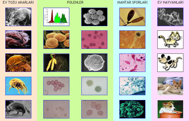 Küfler: Küfler büyümek için neme ihtiyaç duyar. Bodrum veya banyo gibi nemli yerlerde, çimlerin arasında bulunabilir. Küf sporlarını solumak alerjik bir reaksiyona neden olabileceği için, bahçede yere dökülen yaprakları tırmıkla toplamak gibi semptomları tetikleyebilecek aktivitelerden kaçınılmalıdır. Evin nemli bölgelerinde havanın hareket etmesi sağlanmalı, küfleri kontrol etmeye yardımcı olması için bir nem giderici cihaz kullanılmalıdır.