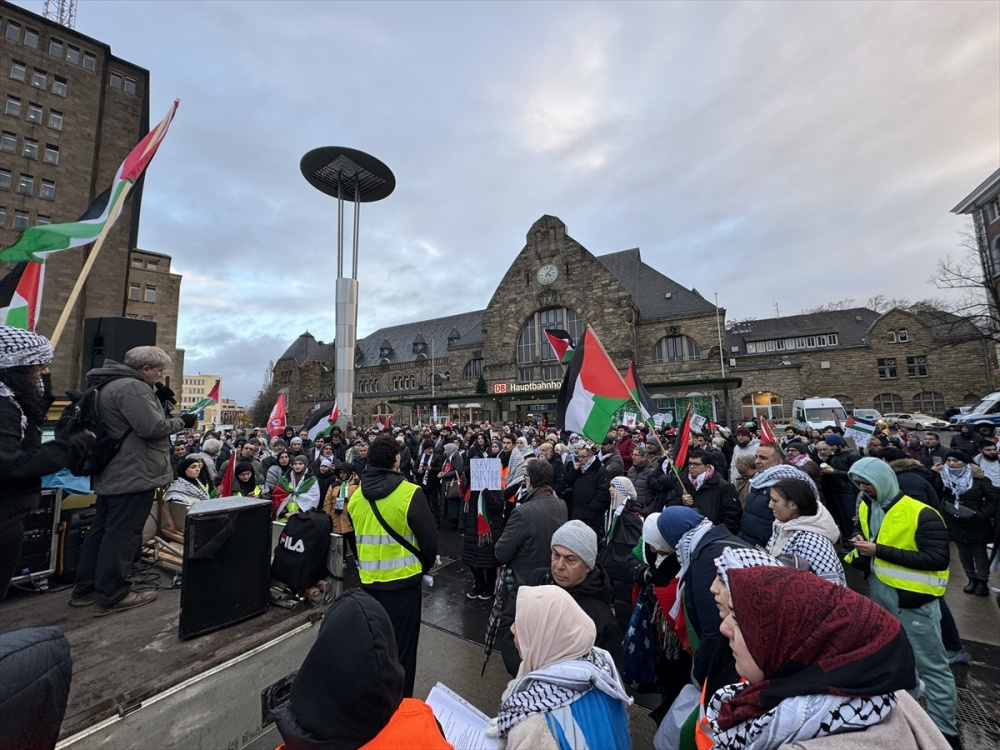 Soğuk havaya rağmen Aachen ana tren istasyonu yakınlarında toplanan göstericiler, ellerinde Filistin bayrakları, üzerinde çeşitli sloganların yer aldığı dövizler ve öldürülen bebeklerin temsili maketlerini taşıyarak “Filistin’e özgürlük” sloganları attı.