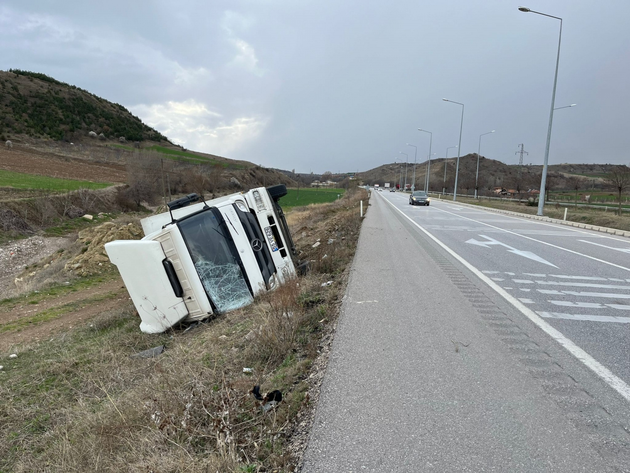 Hasan Ç. (49) yönetimindeki 55 VE 626 plakalı kamyon, kontrolden çıkarak Merzifon-Çorum kara yolunun 20. kilometresinde Çaybaşı köyü yakınlarındaki boş araziye devrildi.