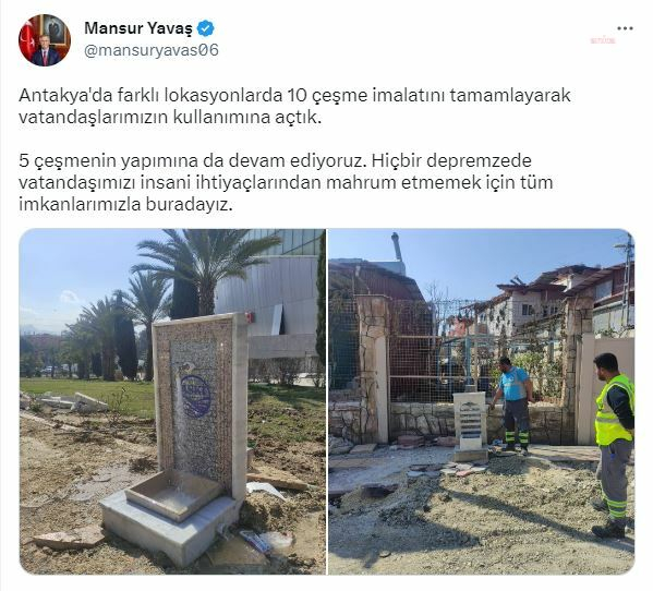 Mansur Yavaş bununla ilgili sosyal medya hesabından yaptığı paylaşımda, “Antakya’da farklı lokasyonlarda bulunan 10 adet çeşmenin imalatını tamamlayarak vatandaşlarımızın kullanımına açtık. 5 adet çeşmeyi yapmaya devam ediyoruz. herhangi bir depremzedeyi insani ihtiyaçlarından mahrum bırakmak.”