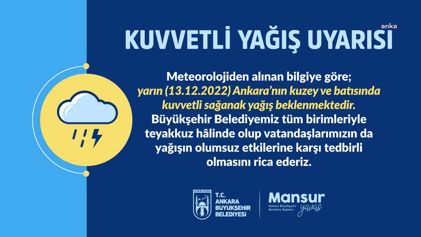 Meteorolojiden alınan bilgiye göre Ankara’nın kuzey ve batısında yarın (12.13.2022) sağanak yağış bekleniyor. Büyükşehir Belediyemiz tüm birimleriyle teyakkuzda olup, vatandaşlarımızdan yağışların olumsuz etkilerine karşı dikkatli olmalarını rica ediyoruz.