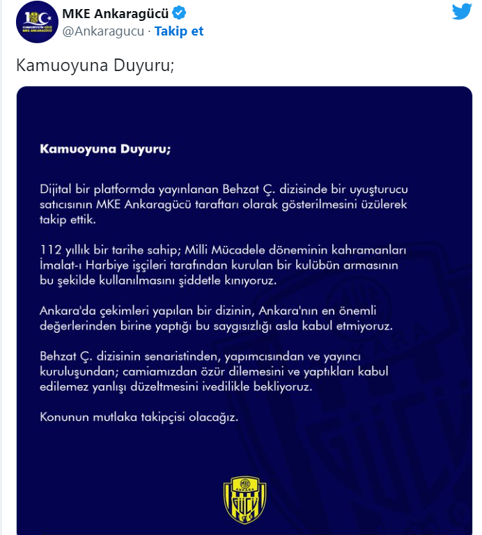 “Dijital platformda yayınlanan Behzat Ç. dizisinde bir uyuşturucu satıcısının MKE Ankaragücü taraftarı olarak gösterilmesini üzüntüyle takip ettik. 112 yıllık kulüp sloganının kullanılmasını şiddetle kınıyoruz. , Ankara’da Kurtuluş Savaşı’nın kahramanları, savaş sanayi işçileri tarafından kurulmuştur.” Ankara’nın en önemli değerlerinden biri olan çekilmiş bir diziye yönelik bu küçümsemeyi asla kabul etmiyoruz. Senarist, yapımcı ve dizi sunucusu Behzat J. Topluluğumuzdan özür diler ve yaptığı kabul edilemez hatayı düzeltir. Kesinlikle takip edeceğiz.”