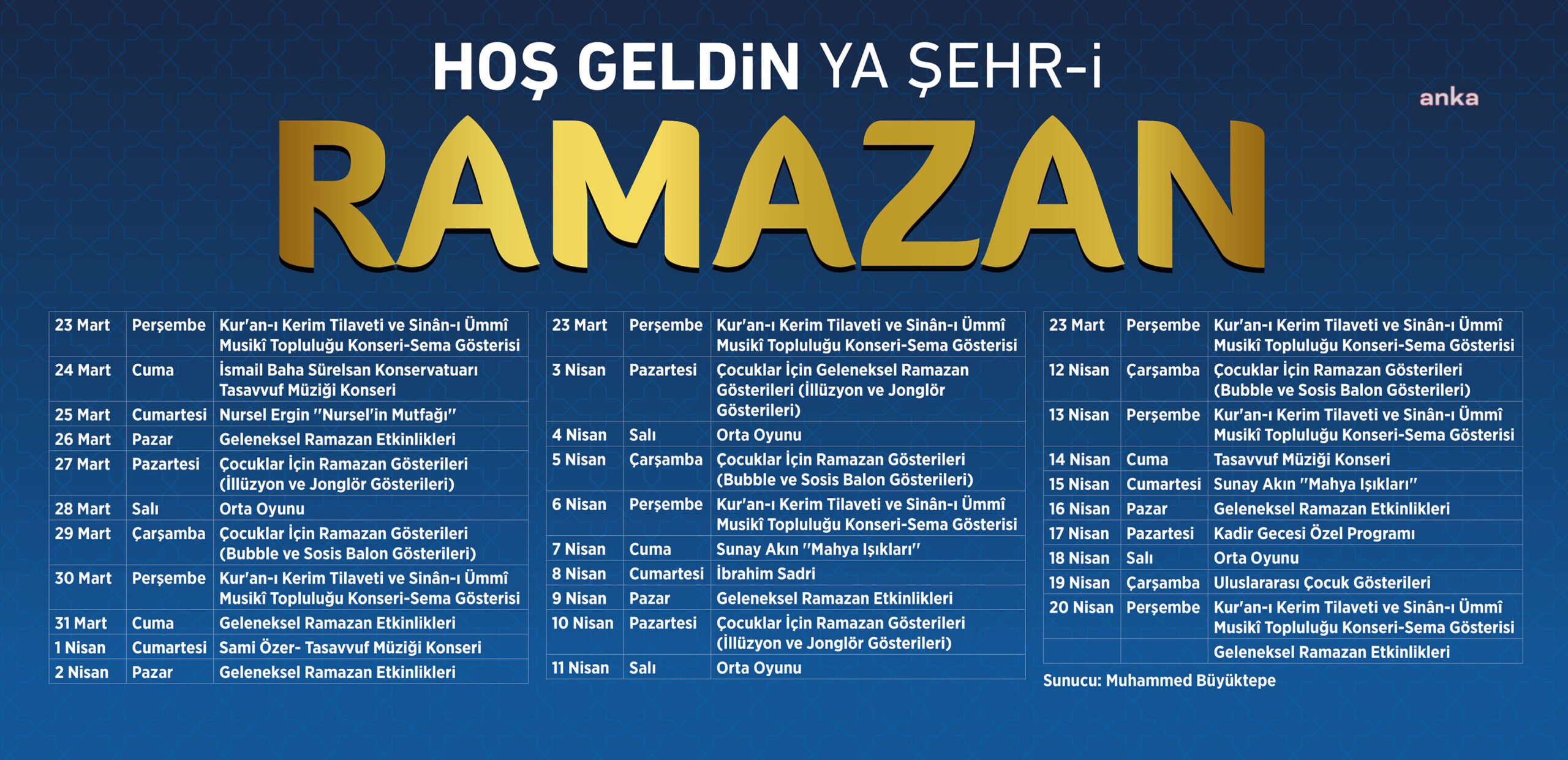 Etkinlikler kapsamında 25 Mart Cumartesi “Nursel Ergin Mutfağı”, 1 Nisan Cumartesi Sami Özer Tasavvuf Müziği Konseri, 7 Nisan Cuma ve 15 Nisan Cumartesi Sunay Akın “Mahya Işıkları” ve Cumartesi İbrahim Sadri, 8 Nisan Antalyalılarla buluşacak.