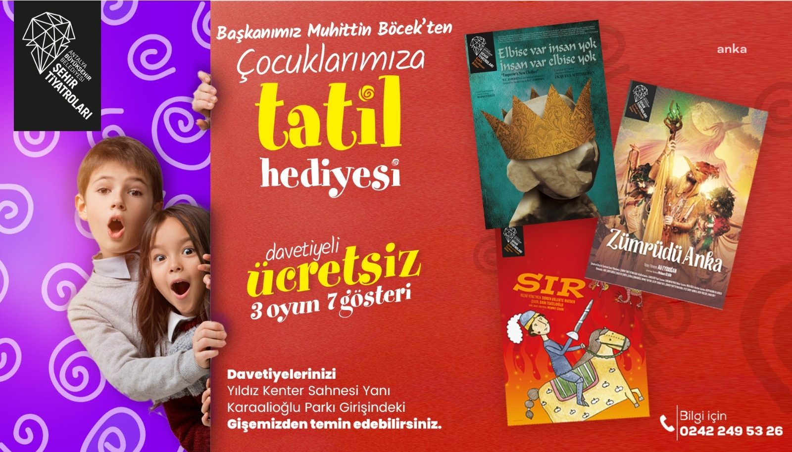 Antalya Büyükşehir Belediyesi, bir haftalık tatilde çocukların eğlenmesi için bir tiyatro sürprizi hazırladı. 7 gösteride çocuklarla buluşacak davetli girilebilen 3 çocuk oyunu.