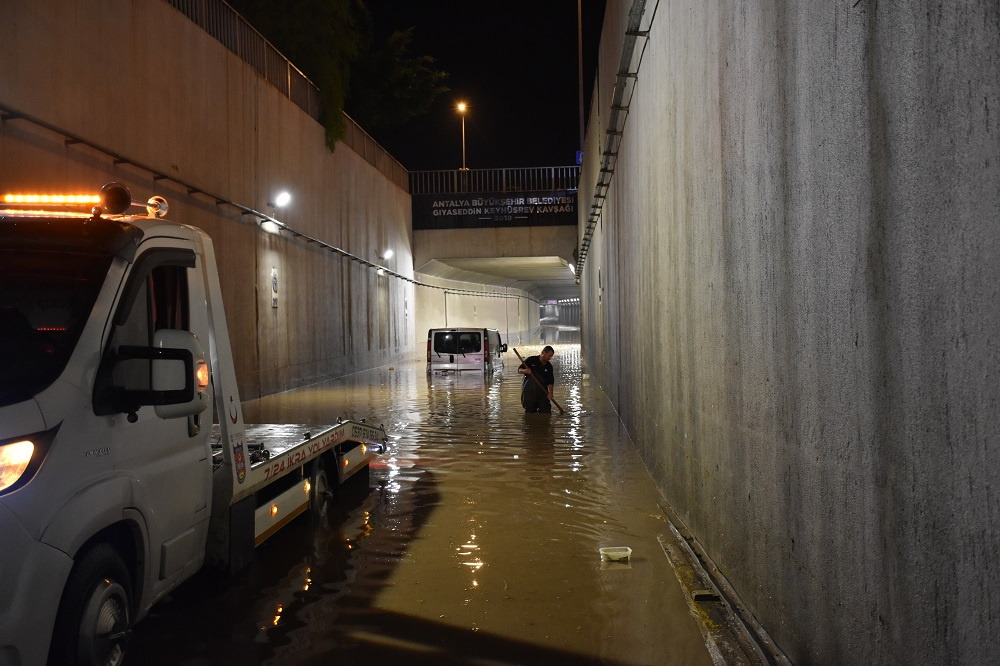 Antalya’nın Kepez ilçesinde bulunan Gıyaseddin Keyhüsrev Kavşağı alt geçidi yağışla birlikte suyla doldu.