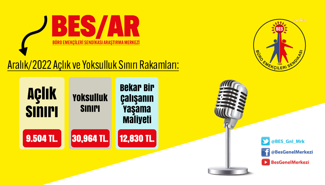Sendikalar Konfederasyonu’na (KESK) bağlı Büro Emekçileri Sendikası, Aralık ayı açlık ve yoksulluk sınırını açıkladı. Böylece ; Aralık ayında 9 bin 504 lira olarak ölçülen açlık sınırı, 1 Ocak itibarıyla 8 bin 506 lira olan asgari ücretin 998 lira üzerinde oldu. Tüm kamu çalışanları, asgari ücret ve emekliler için insani ücret talebini yineleyen BES/AR araştırması şöyle: