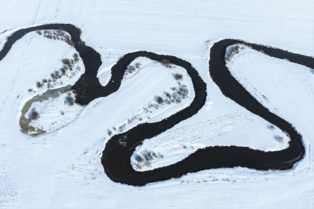 Arpaçay ilçesinde ise çevresi karla kaplı mendereseler dronla görüntülendi.