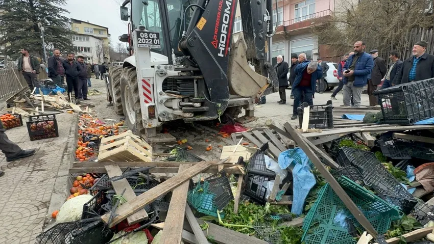 AA’nın haberine göre, pazar tezgahlarını devirip bazı araçlara çarparak durabilen iş makinesi, hasara neden oldu.
