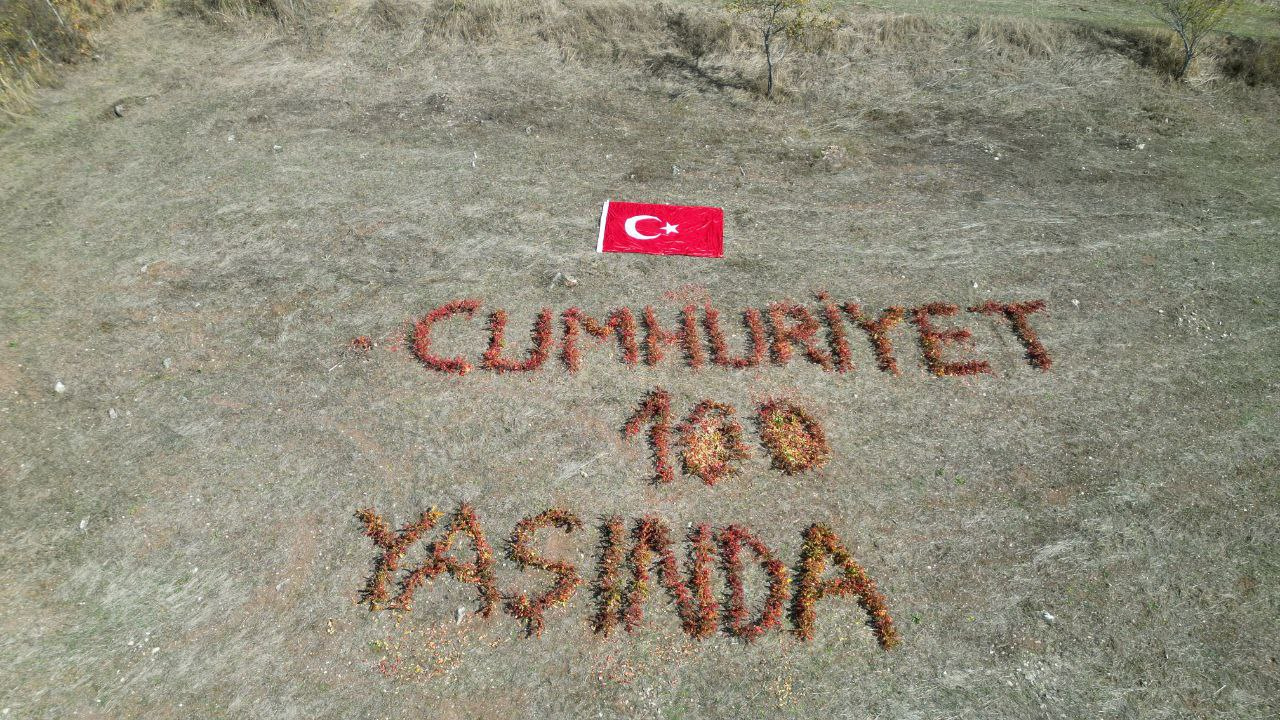 Artvinli Gülhan Gökdemir, Cumhuriyetin yüzüncü yılında iptal edilen programlara rağmen kendi tarlasına sumak ağacının yapraklarıyla “Cumhuriyet Yüz yaşında.” yazdı.