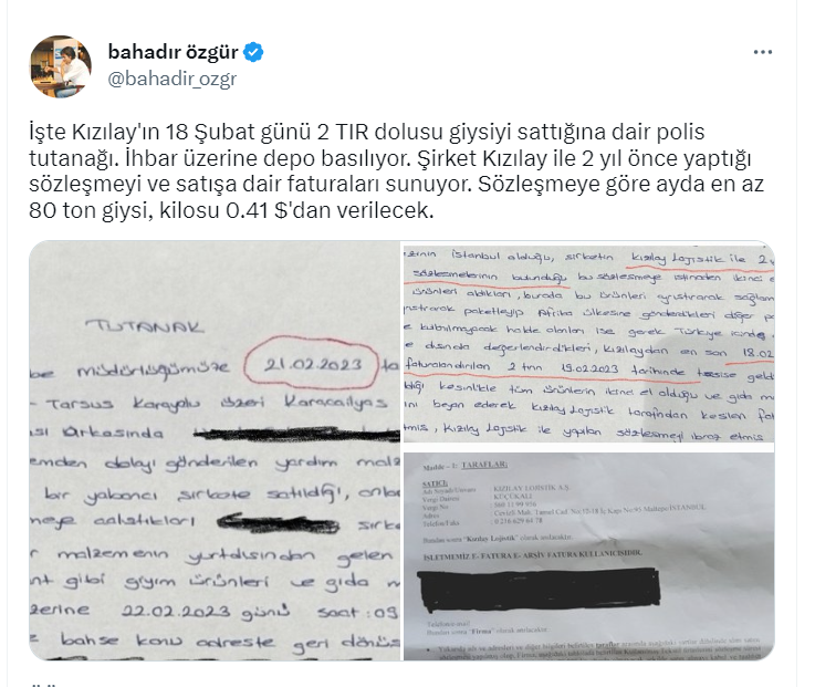 “21.02.2023 tarihinde KOM Şube Müdürlüğümüze gelen tebligatta, Mersin-Tarsun karayolu üzerinde Karacailyas yakınlarındaki Coca Cola fabrikasının arkasında bulunan fabrikaya gönderilen yardım malzemelerinin burada Kızılay tarafından bir yabancıya satıldığı belirtildi. ucuz fiyata pazara sokmaya çalıştıkları firma. Depremzedeler için yurt dışından gelen depremzedeler için battaniye, mont ve gıda maddeleri gibi giyim ürünleri, deprem antrepo deposunda 7 konteyner yeni malzeme olduğu ihbarı üzerine, 22.02.2020 tarihinde .2023 saat 09:00’da belirtilen adrese ulaşıldığında İstanbul’daki Geri Dönüş Merkezi Geri Dönüşüm firması için Kızılay Lojistik ile irtibata geçilmiş ve firma bu iki yıllık sözleşmeye istinaden kullanılmış tekstil ürünleri satın almış, katıları ayrıştırıp paketlemiştir. bu ürünleri ayırıp Afrika ülkesine gönderecek, diğer yırtık ve uygun olmayan ürünler değerlendirilirken Kızılay’dan Türkiye içinde ve dışında kullanılmak üzere Kızılay Lojistik tarafından düzenlenen 18.02.2023 fiyatına 2 tır olduğunu beyan eden faturayı ibraz ediniz. 19.02.2023 tarihinde tesise gelmiş ve tüm malları ayıklamış ve beyan etmiştir. Tamamen ikinci el ürünler olduğunu ve gıda maddesi almadıklarını…”