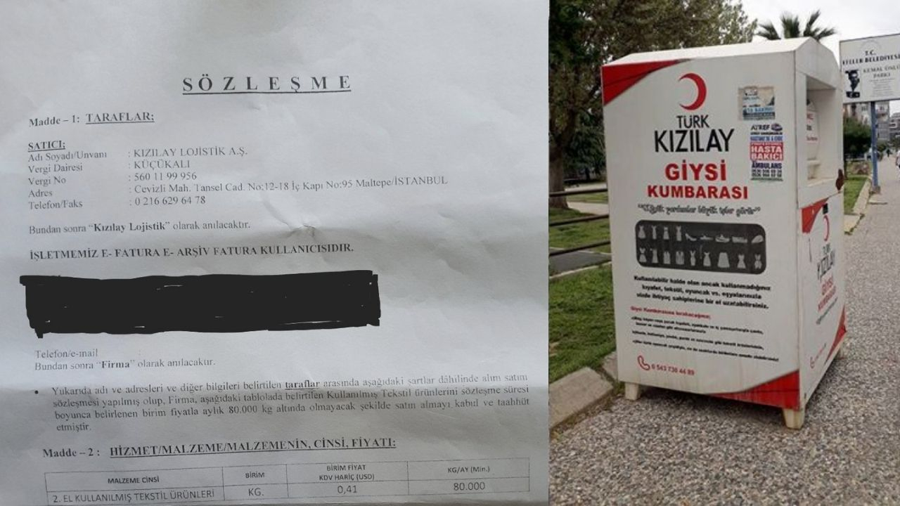 Twitter hesabından paylaşımda bulunan Özgür, “İlanda depo yazıyor. Firma Kızılay ile 2 yıl önce yaptığı sözleşmeyi ve satış faturalarını ibraz ediyor. Sözleşmeye göre en az 80 ton. ” aylık kıyafet kilosu 0,41 dolardan.