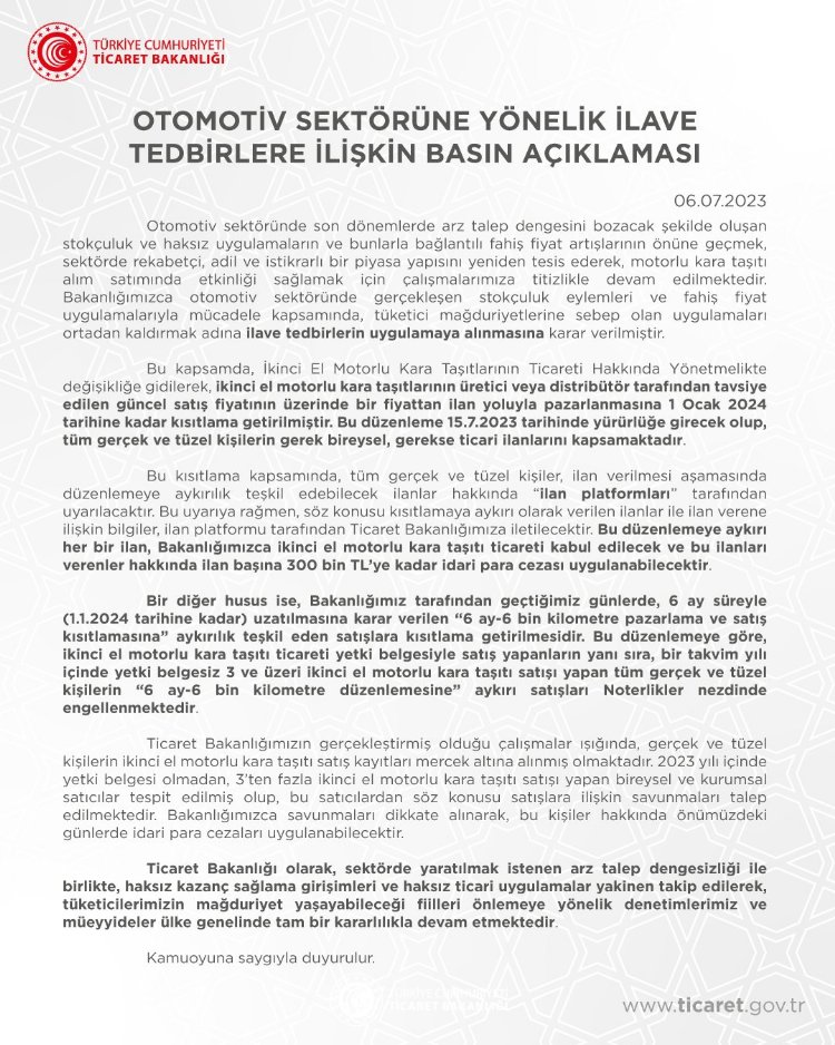 2024 yılına kadar kullanılmış araçların, üreticinin veya distribütörün tavsiye ettiği cari satış fiyatından daha yüksek bir fiyata pazarlanmasına kısıtlama getiriliyor. 15 Temmuz’da yürürlüğe girecek olan Resmi Gazete’de yayımlanan kararın ardından Ticaret Bakanlığı sektöre yönelik ek tedbirlere ilişkin basın açıklaması yaptı.