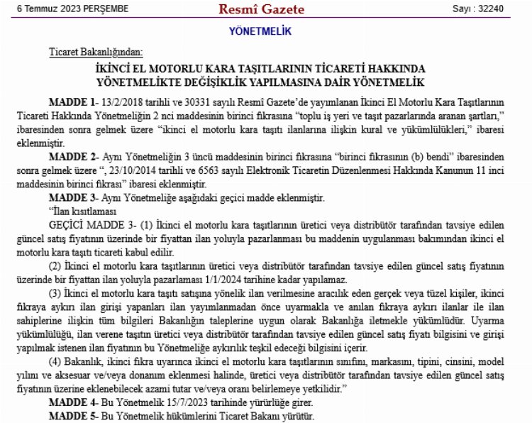 İkinci el araç alım satım yönetmeliğinde yapılan değişikliğin Resmi Gazete’de yayımlanması.