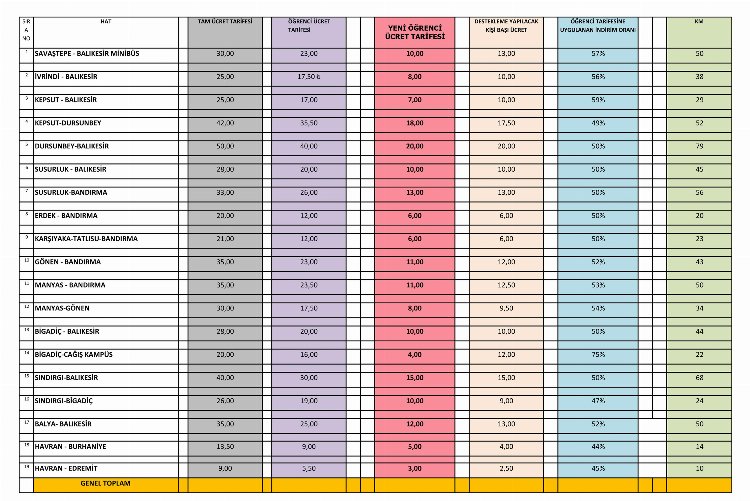 İndirimli hatlar ve eski yeni fiyatlar Savaştepe – Balıkesir 23 TL’den 10 TL’ye, İvrindi – Balıkesir 18 TL’den 8 TL’ye, Kepsut – Balıkesir 17 TL’den 7 TL’ye, Kepsut – Dursunbey 35,5 TL’den 18 TL’ye, Dursunbey – Balıkesir 40 TL’den 20 TL’ye, Susurluk – Balıkesir 20 TL’den 10 TL’ye, Susurluk-Bandırma 26 TL’den 13 TL’ye, Erdek – Bandırma 12 TL’den 6 TL’ye, Karşıyaka – Tatlısu – Bandırma 12 TL’den 6 TL’ye, Gönen – Bandırma 23 TL’den 11,50 TL’ye, Minyas – Bandırma 23,50 TL’den 11,75 TL’ye, Manias Gönen 17,50 TL’den 10 TL’den 10 TL’ye Balea Balıkesir 25 TL’den 12,50 TL’ye Havran-Burhaniye 9 TL’den 5 TL’ye Havran – Edremit 5,5 TL’den TL’den 3 TL’ye.