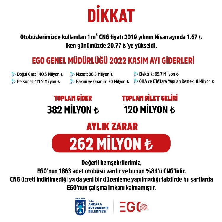 Açıklamada, Genel Müdürlüğün 2022 Kasım ayı toplam giderlerinin 382 milyon lira, bilet gelirlerinin ise 120 milyon lira olduğu belirtilirken, aylık zararının da 262 milyon lira olduğu teyit edildi.