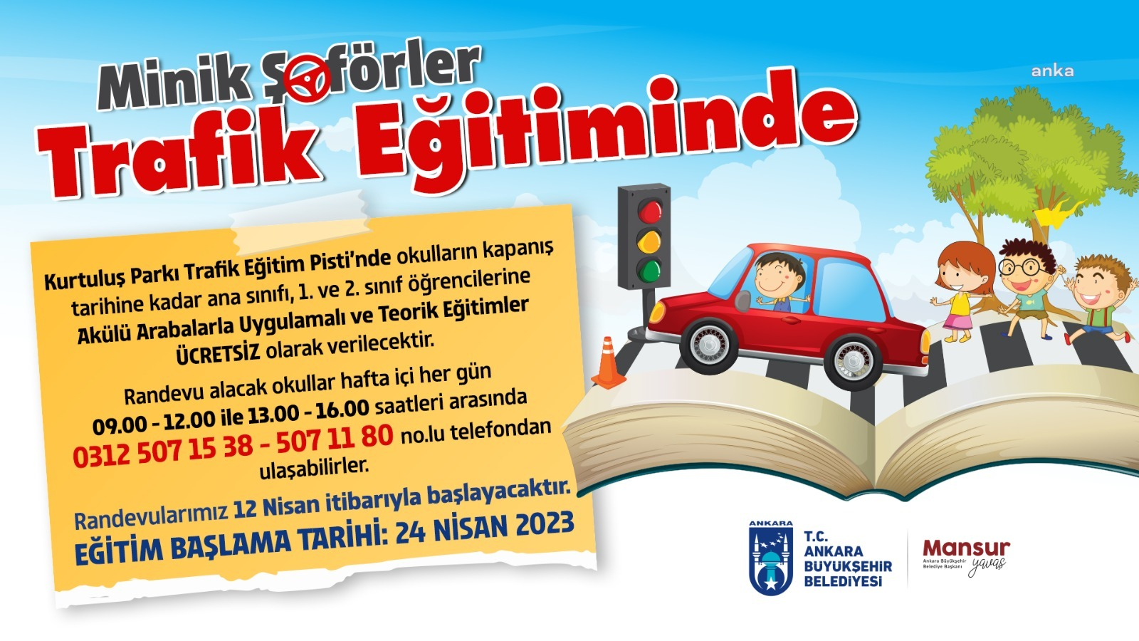 Trafik eğitimlerine katılmak isteyen okullar, 24 Nisan’da ilk zil çaldığında hafta içi 09.00-12.00 ve 13.00-16.00 saatleri arasında “(0312) 507 15 38-507 11 80” numaralı telefondan randevu alabilecek, 12 Nisan’dan itibaren.