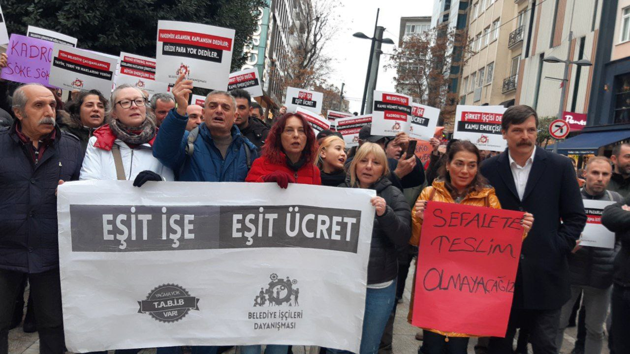 Eşit işe eşit ücret pankartının asıldığı basın açıklamasına TİP Yönetim Kurulu Başkanı Erkan Baş, TİP Sözcüsü Sera Kadgil ve TİP İstanbul Teşkilatı destek verdi. Belediye işçileri dayanışması adına basın açıklamasını belediye işçisi Aylin Doğan okudu.