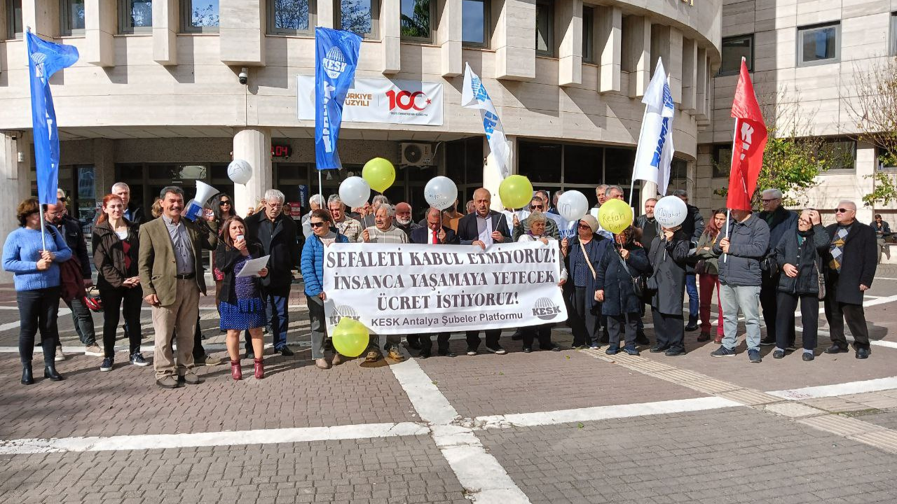 KESK üyeleri attıkları sloganlarla AKP iktidarını protesto etti. KESK Antalya Şubeler Platformu adına açıklama yapan BES Antalya Şube Başkanı Devrim Mol “ Yeni yıla girdik. Ama değişen bir şey yok. Zam yağmuru temel tüketim maddelerinden, gıda ürünlerine, akaryakıt ürünlerinden tekel ürünlerine kadar iğneden ipliğe sürüyor” dedi. Bu koşularda Ocak 2024 itibari ile altı aylık enflasyon farkı (%29,78) artı toplu sözleşme artışı (%15) ile maaşlarımızın toplamda %49,25 artacak olması büyük bir müjde gibi sunuluyor diyen Devrim Mol konuşmasının devamında şunları ifade etti;