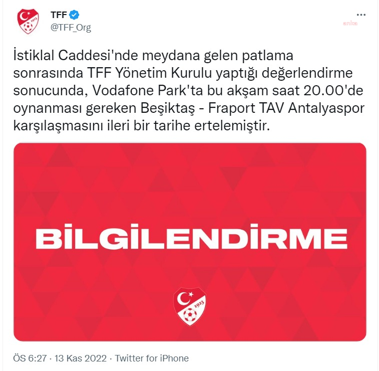 İstiklal Caddesi’nde meydana gelen patlamanın ardından TFF Yönetim Kurulu’nun yaptığı değerlendirme sonucunda, bu akşam 20.00’de oynanması beklenen Beşiktaş ile Fraport Antalyaspor karşılaşması ileri bir tarihe ertelendi.