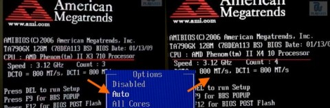 Bu işlem AMI BIOS’larda çok basittir ve BIOS’lara “Gelişmiş Saat Kalibrasyonu” seçeneği sunar. Standart olarak “Disabled” olarak gelen BIOS’un bu seçeneğini Auto olarak ayarlıyorsunuz ve F10 ile BIOS’u kaydedip sistemi yeniden başlattığınızda artık 3 yerine 4 çekirdekli Phenom II Quad işlemciye sahipsiniz. piyasadaki en ucuz Phenom X3 işlemci 199 TL ve en ucuz Phenom X4 işlemci 325 TL ile %50’den fazla kazanmak mümkün hale geliyor.