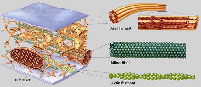Hücre yapısına güç ve esneklik veren mitokondri, endoplazmik retikulum, Golgi gövdesi, lizozom benzeri retikulum gibi hücre ve organellerin içindeki özel yapısal proteinler ve sargılardan oluşur. Hücre iskeleti proteinlerden oluşur ve kalınlıklarına göre dört farklı gruba ayrılır.