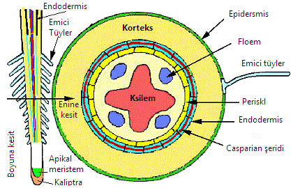Kökün enine kesiti incelendiğinde meristemin hemen arkasındaki alanda iç içe geçmiş üç alan ayırt edilebilir. bunlar; (1) dış ektoderm; (ii) protooderm altında yer alan büyük bir parankimal bazal doku; (3) Damar dokusunun ön kısmının çekirdeğidir ve özellikle uzun hücrelerden oluşur. Embriyoda olduğu gibi, birincil endoderm epidermiste hızla olgunlaşır ve vasküler medulla, kütikülün birincil dokularında olgunlaşır: birincil ksilem, birincil floem ve vasküler kambiyum. Büyüyen gövdeler benzer bir farklılaşma modelini takip eder. Bununla birlikte, genellikle iki ana doku alanı vardır. Birincisi protooderm ile korteksi ve endodermi oluşturan “kalp silindiri” arasında, ikincisi ise medullaya dönüşen epiblastın içinde yer alır.