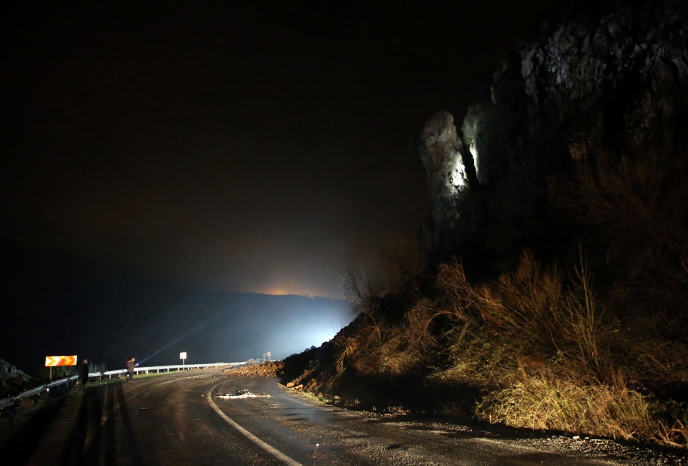 Jandarma ve polis ekiplerinin önlem almasının ardından bölgeye getirilen DSİ’ye ait iş makinesiyle yola düşme tehlikesi bulunan kaya blokları kırıldı.