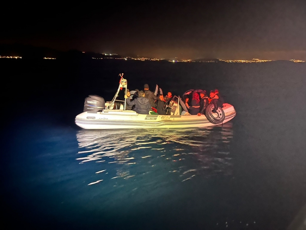 Ekiplerce, hareketli lastik bot durdurularak yasa dışı yollarla yurt dışına gitmeye çalışan 17 düzensiz göçmen yakalandı.
