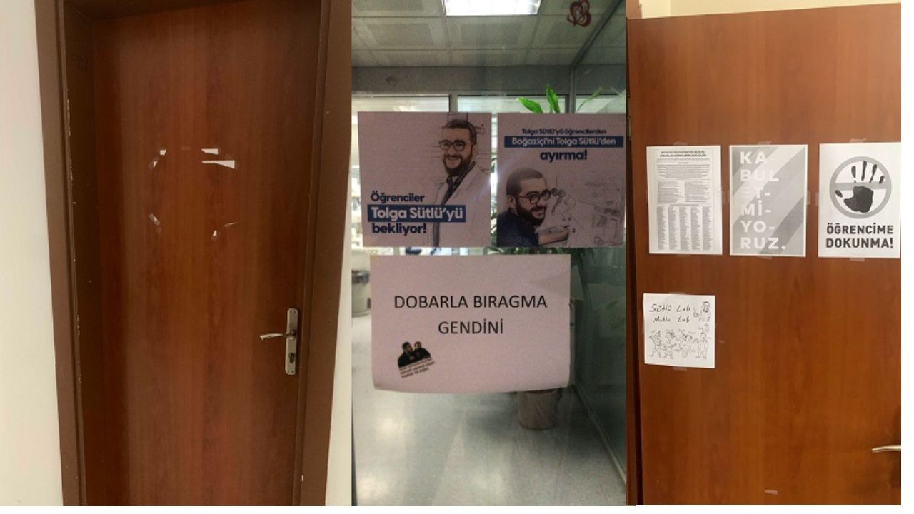 Boğaziçi Üniversitesi akademisyenlerinin odalarının kapısına astığı pankart ve afişler özel güvenlik tarafından toplandı. Kendilerine dokunmalarına izin verilmeyen akademisyenlerin kapıları fotoğraflandı.