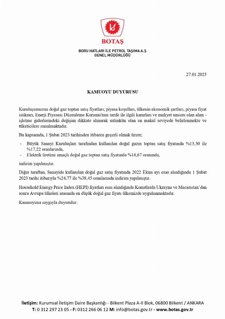 BOTAŞ’tan yapılan yazılı açıklamaya göre, 1 Şubat 2023 itibarıyla büyük sanayi kuruluşlarının kullandığı gazın toptan satış fiyatı yüzde 13,30 ile 17,22 arasında değişiyor; Elektrik üretimi amaçlı toptan gaz satışında yüzde 16,67 indirim yapıldı.