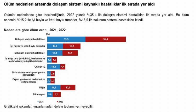 Nedenlerine göre ölümler incelendiğinde 2022 yılında %35,4 ile dolaşım hastalıkları ilk sırada yer aldı. Ölüm nedenlerini %15,2 ile iyi huylu ve kötü huylu tümörler, %13,5 ile solunum yolu hastalıkları izledi.