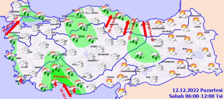 Rüzgâr: Genel olarak güneyli yönlerden hafif, Marmara’nın güneyi, Antalya Körfezi ve Orta Karadeniz’in yer yer orta kuvvette, yer yer kuvvetli (30-60 km/sa) olarak esmesi bekleniyor.