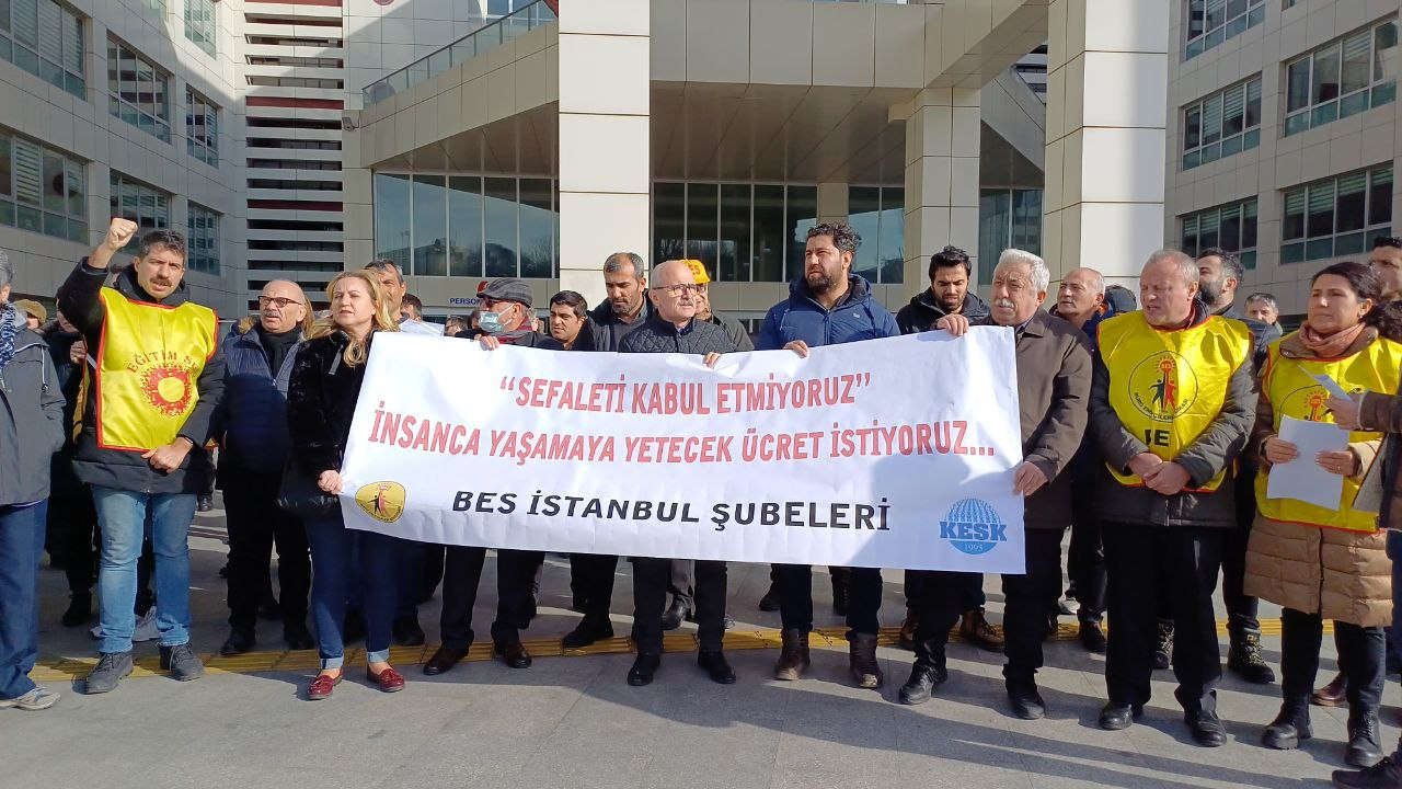 BES İstanbul Şubeleri, ‘Sefaleti Kabul Etmiyoruz! İnsanca Yaşamaya Yetecek Ücret İstiyoruz” şiarıyla Fatih’te bulunan İstanbul Vergi Dairesi Başkanlığı önünde kamu emekçilerine dayatılan sefalet ücretini protesto etti.