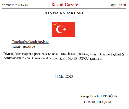 Öte yandan bugün yayımlanan Resmi Gazete’de Cumhurbaşkanı Recep Tayyip Erdoğan’ın imzasıyla Kahramanmaraş’ta meydana gelen depremlerde hayatını kaybeden Hatay Devlet Müftüsü Ömer Faruk Belgeli’nin yerine Mevlüt Topçu atandı. Sakarya Müftü Yardımcısı Muhammed Şahin Çankırı Müftüsü oldu.