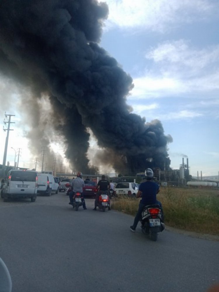 Yangının halen etkili olduğu bölgede, çevre fabrikaları tamamen tahliye edilirken oluşan yoğun duman yaklaşık 40 kilometre öteden dahi görülüyor.